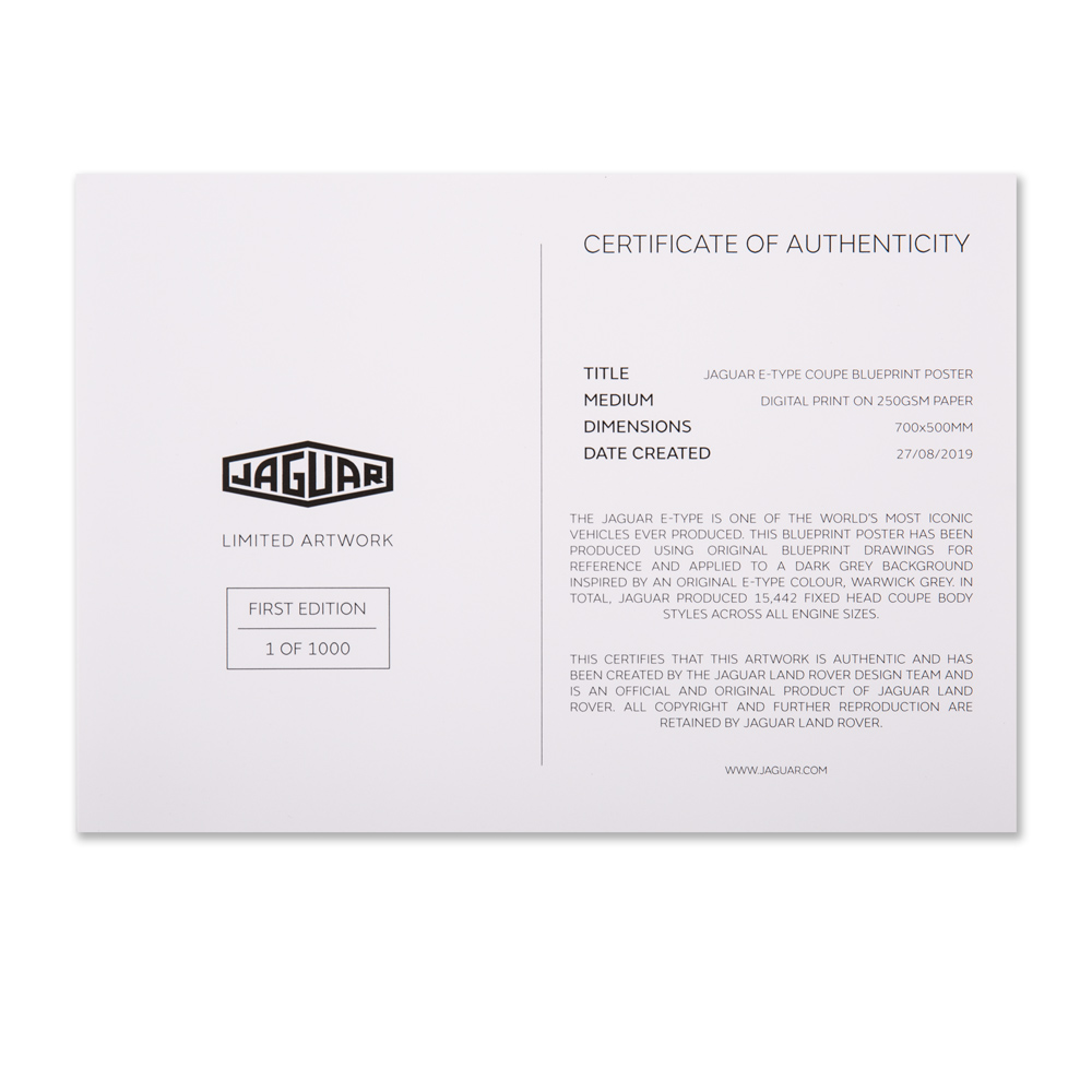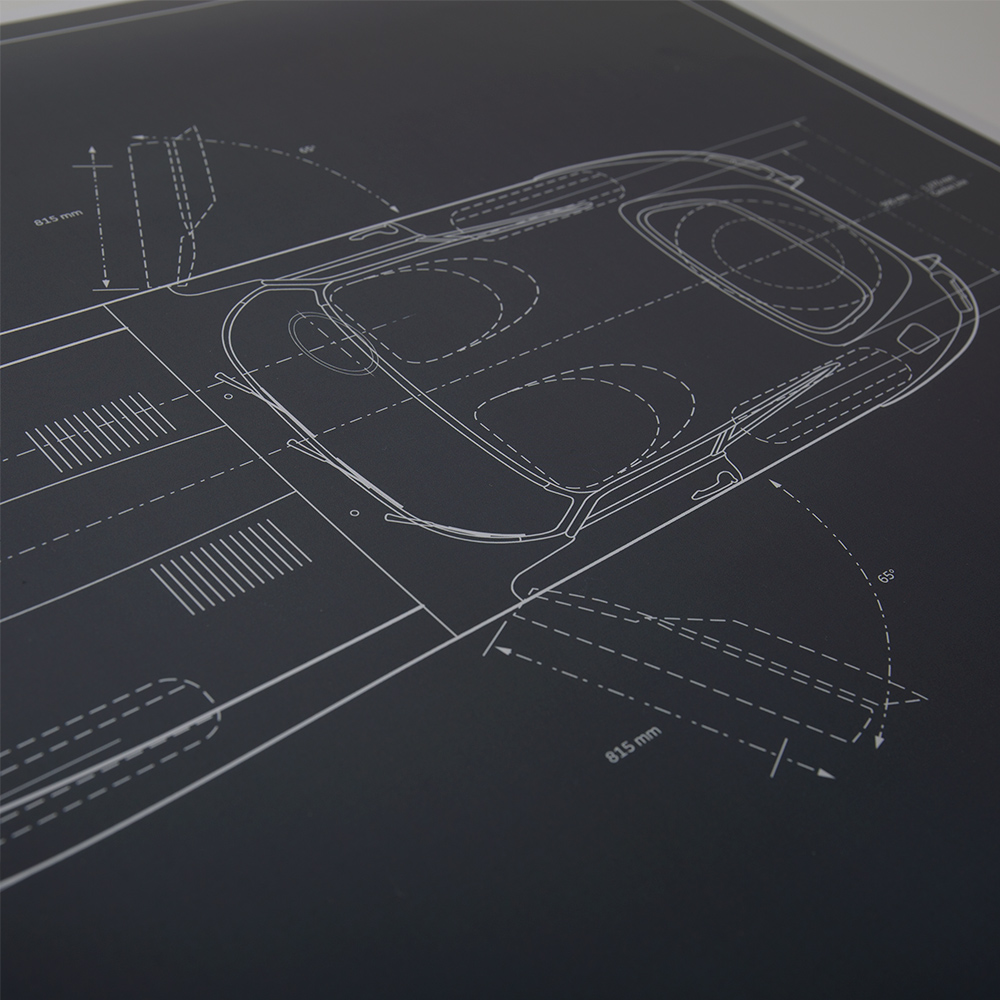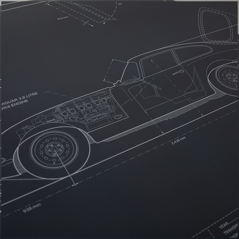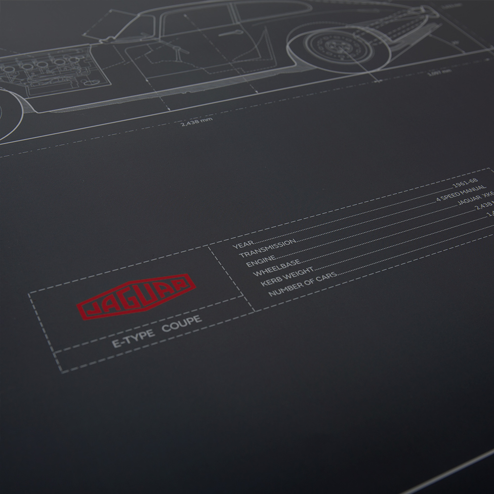 A limited edition poster featuring schematics of the iconic Jaguar E-type. Strictly limited to 1000 prints worldwide. Designed using authentic blueprints and applied to a Warwick Grey background.