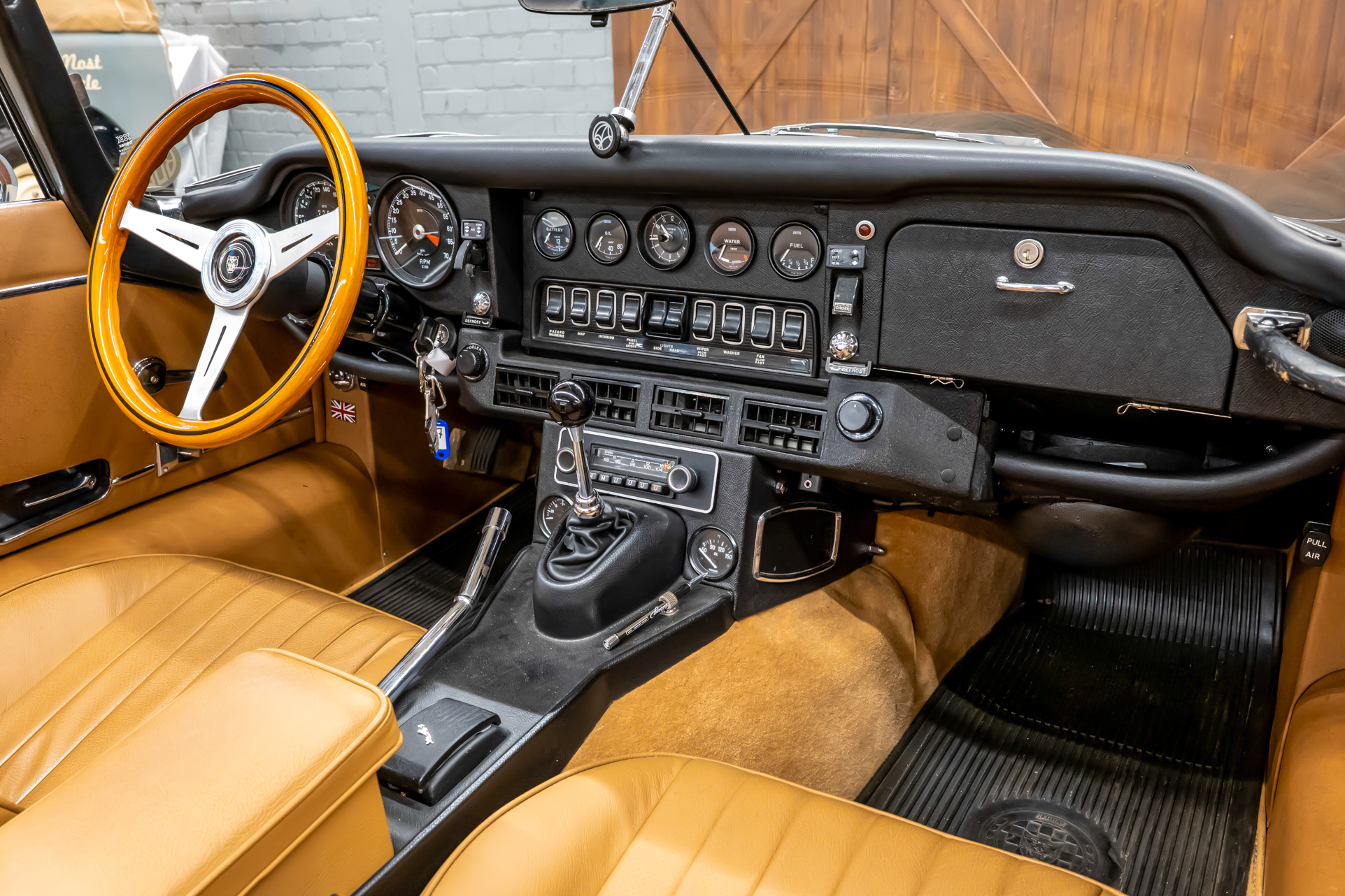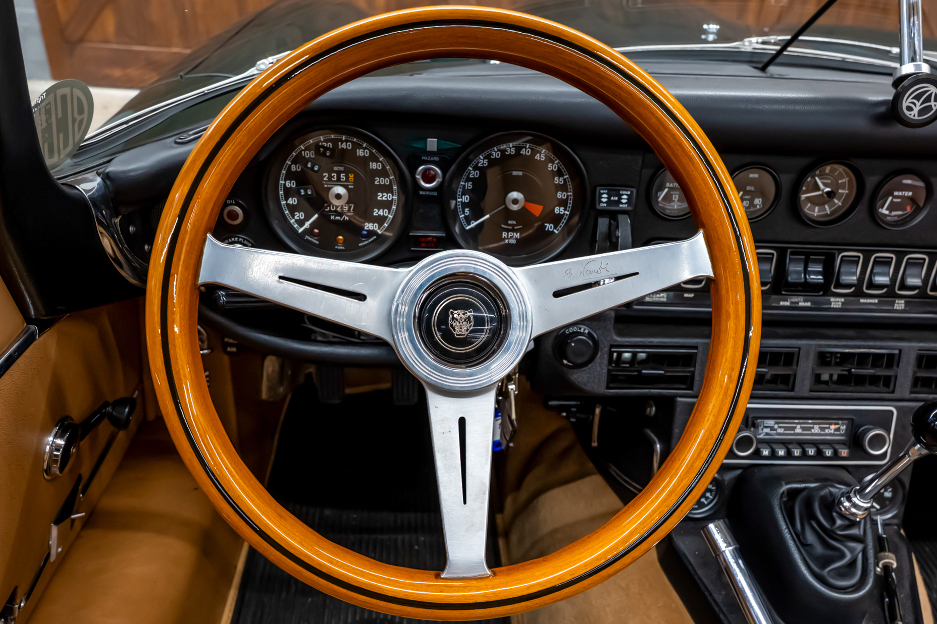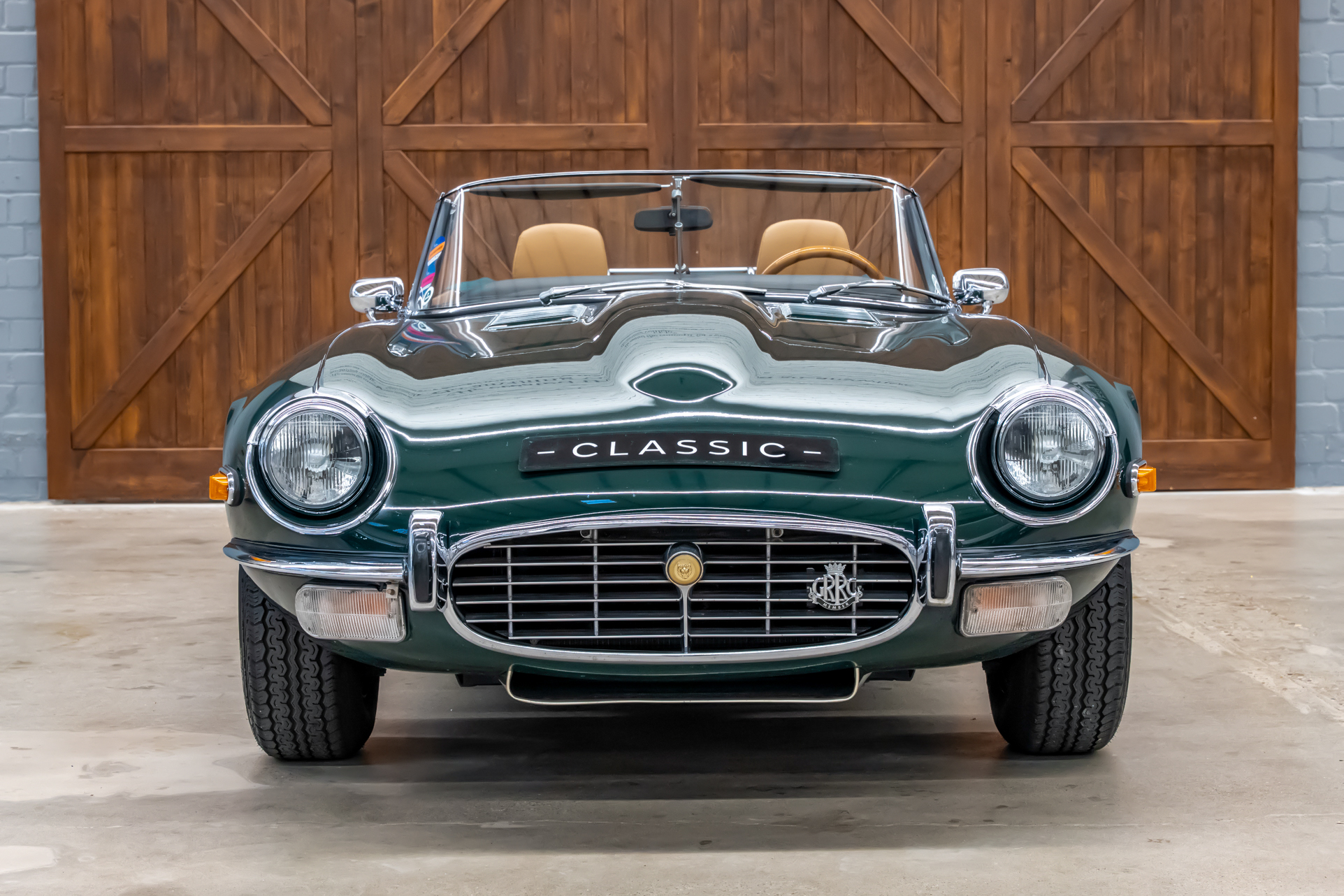 This Jaguar E‑Type Series 3 pairs iconic design with the smooth power of a 5.3‑litre V12 engine, manual transmission, and air conditioning — one of the most desirable specifications.