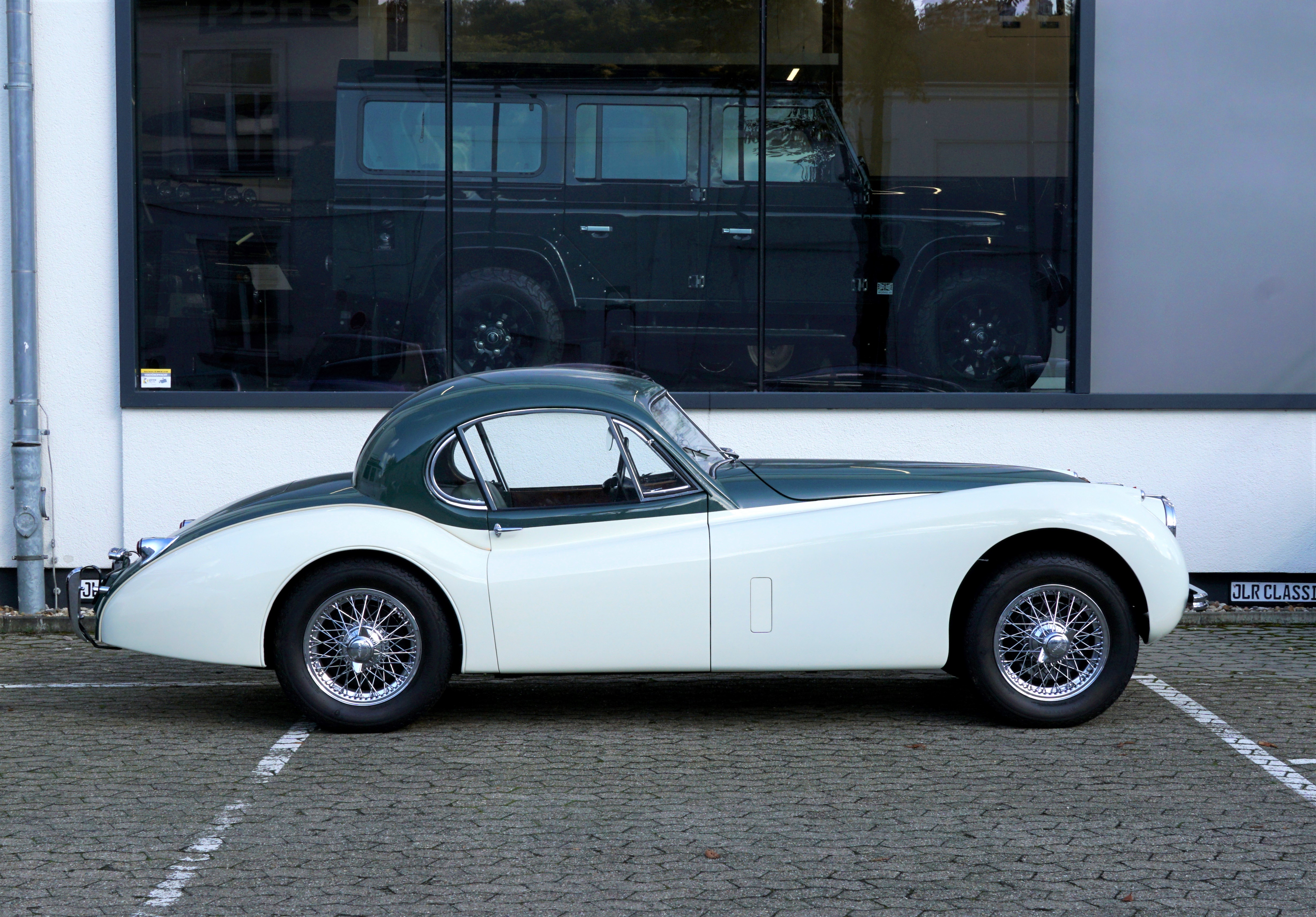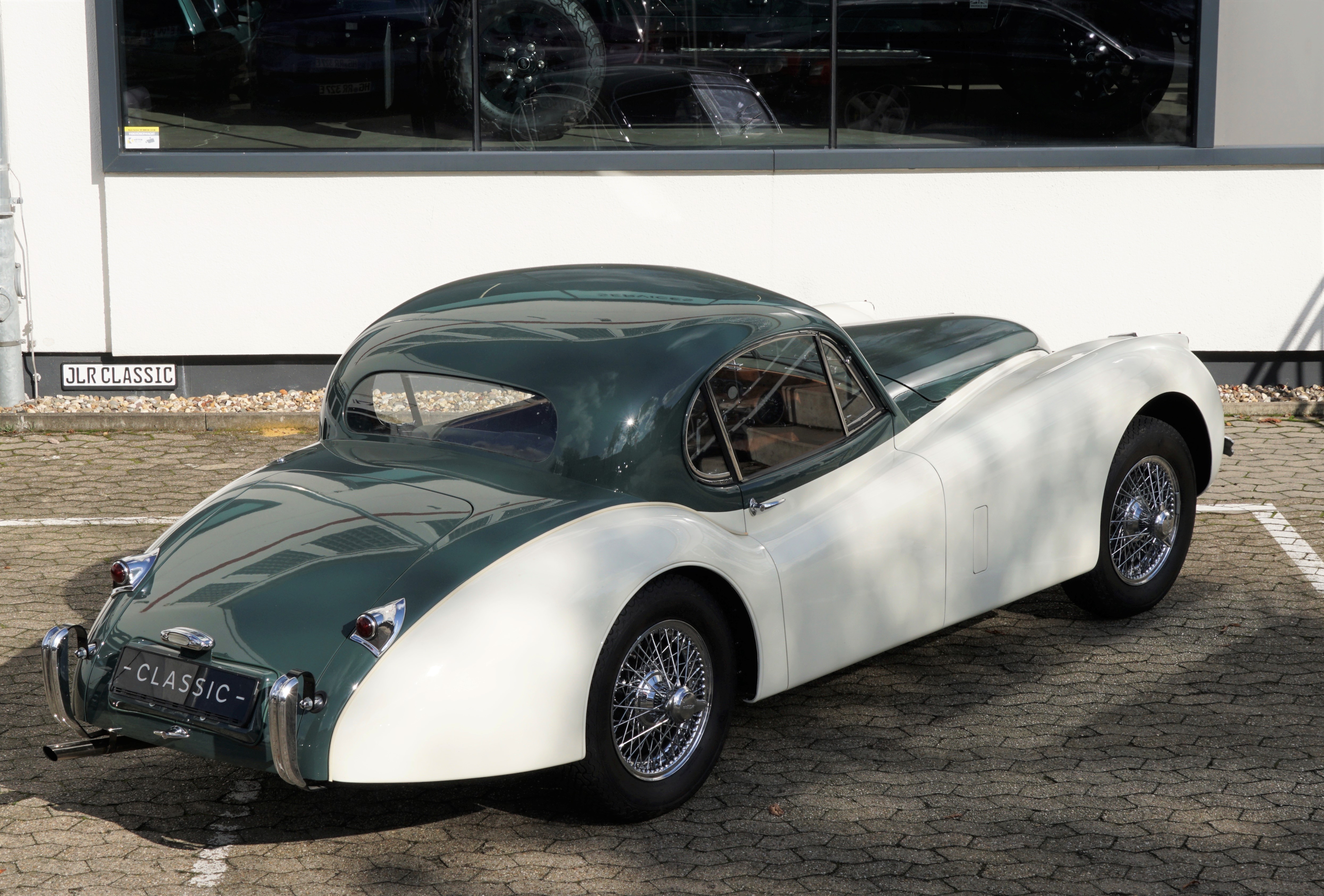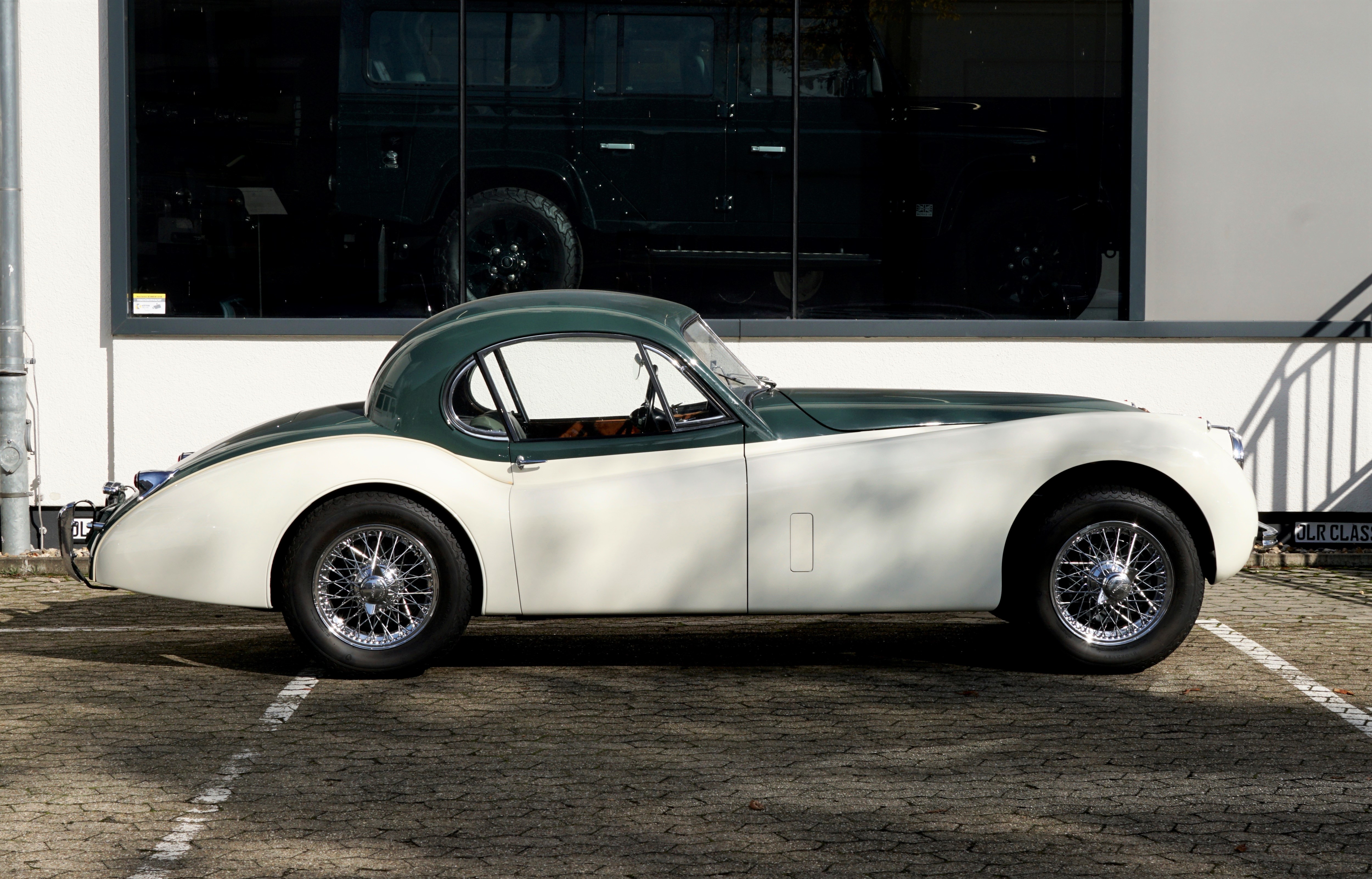 Fantastic XK 120 DHC in the colour combination Green over Cream/ Interior Suede with full Matching Numbers and rounded off by the matching chrome spoke rims. This colour combination, which was demonstrably the only one ever produced in its original form, was inspired by Sir Sterling Moss' XK120 FHC.