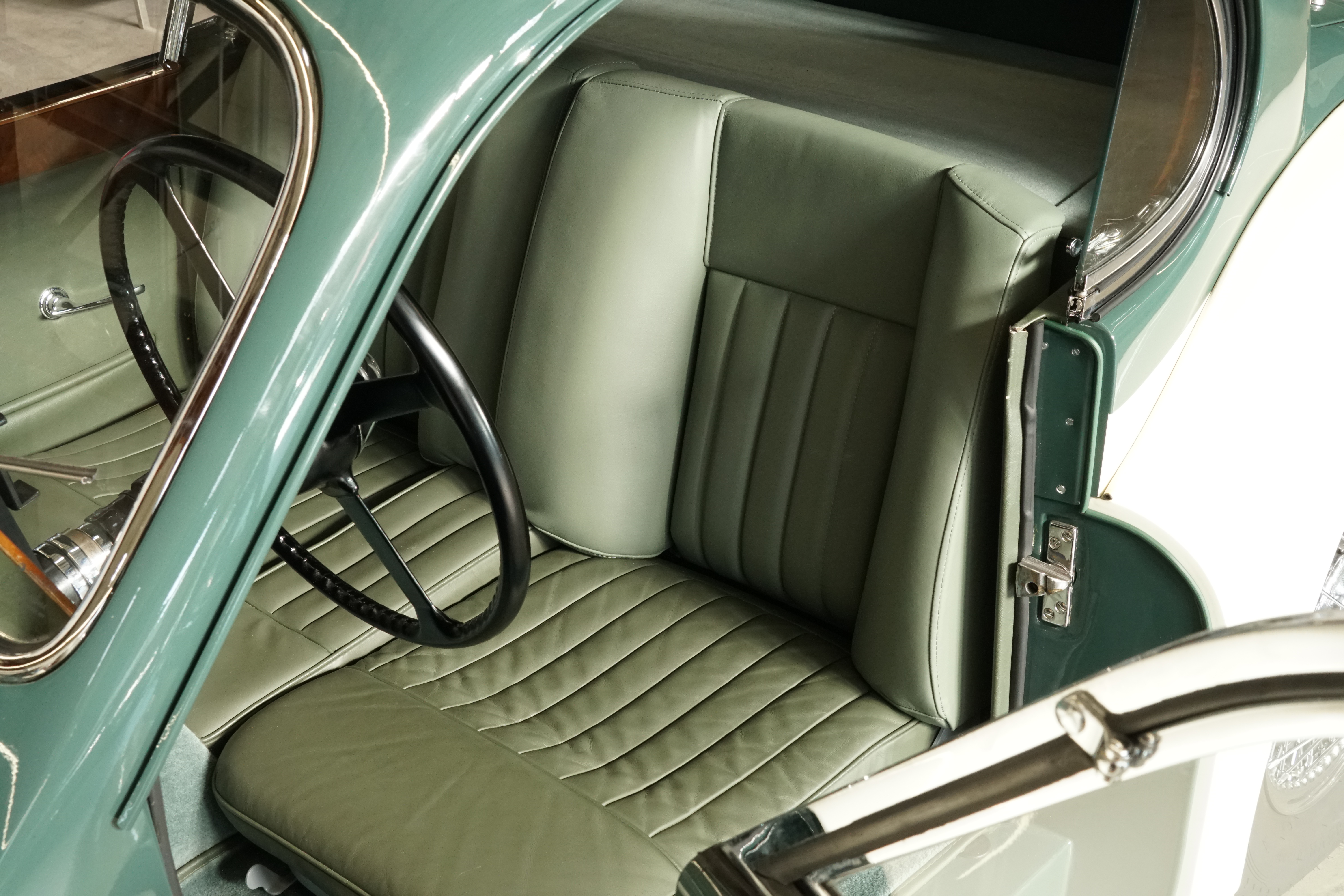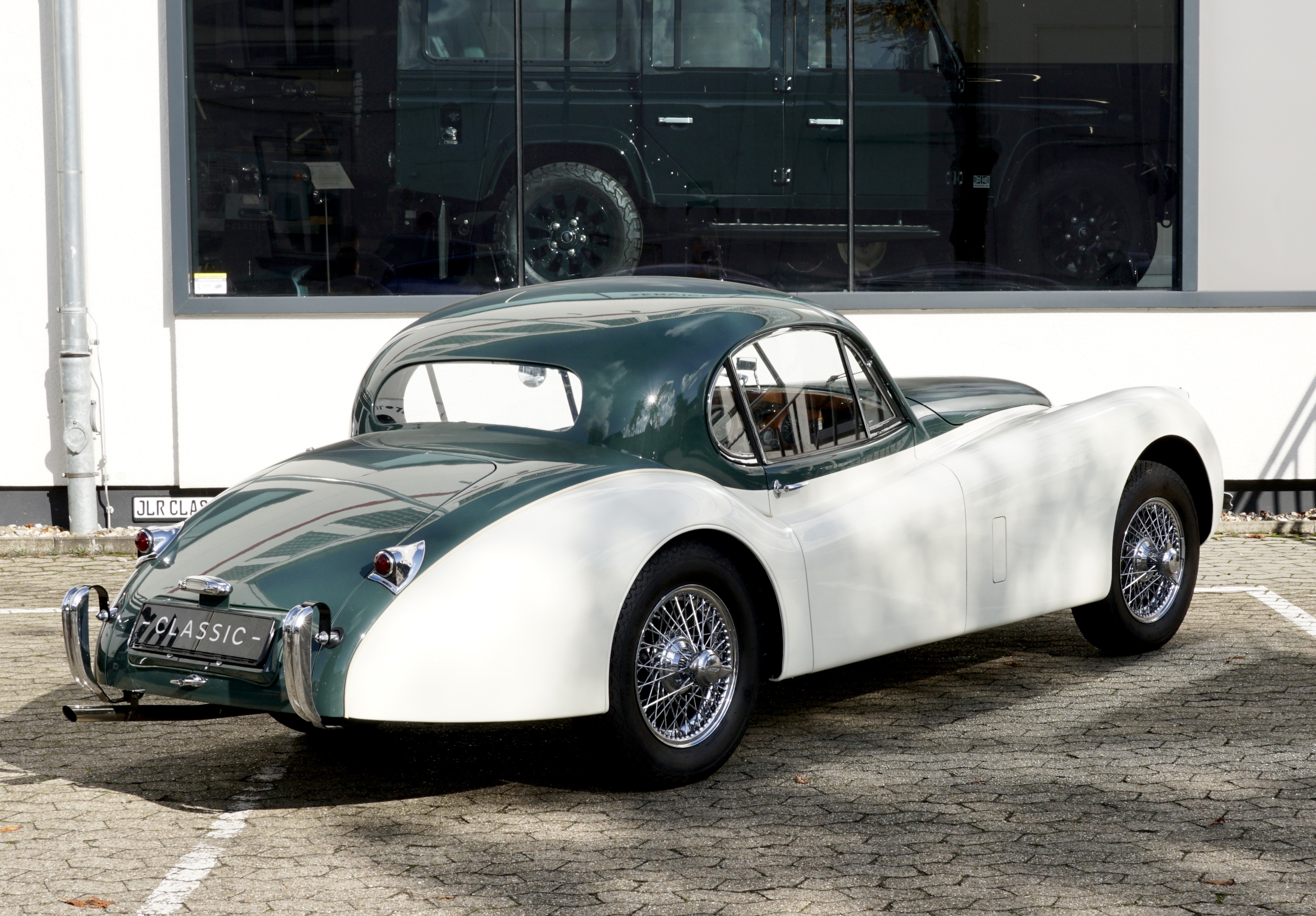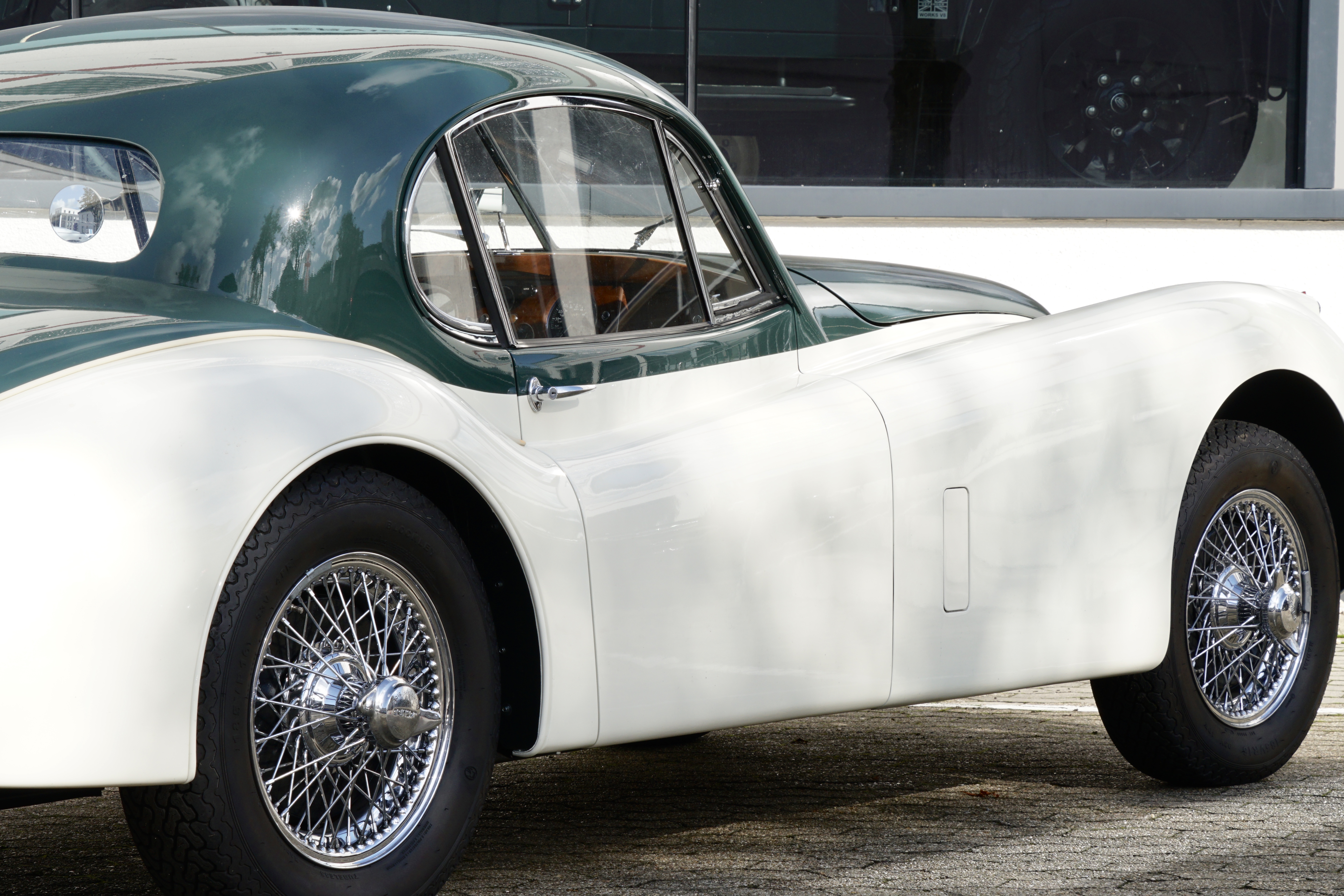 Fantastic XK 120 DHC in the colour combination Green over Cream/ Interior Suede with full Matching Numbers and rounded off by the matching chrome spoke rims. This colour combination, which was demonstrably the only one ever produced in its original form, was inspired by Sir Sterling Moss' XK120 FHC.