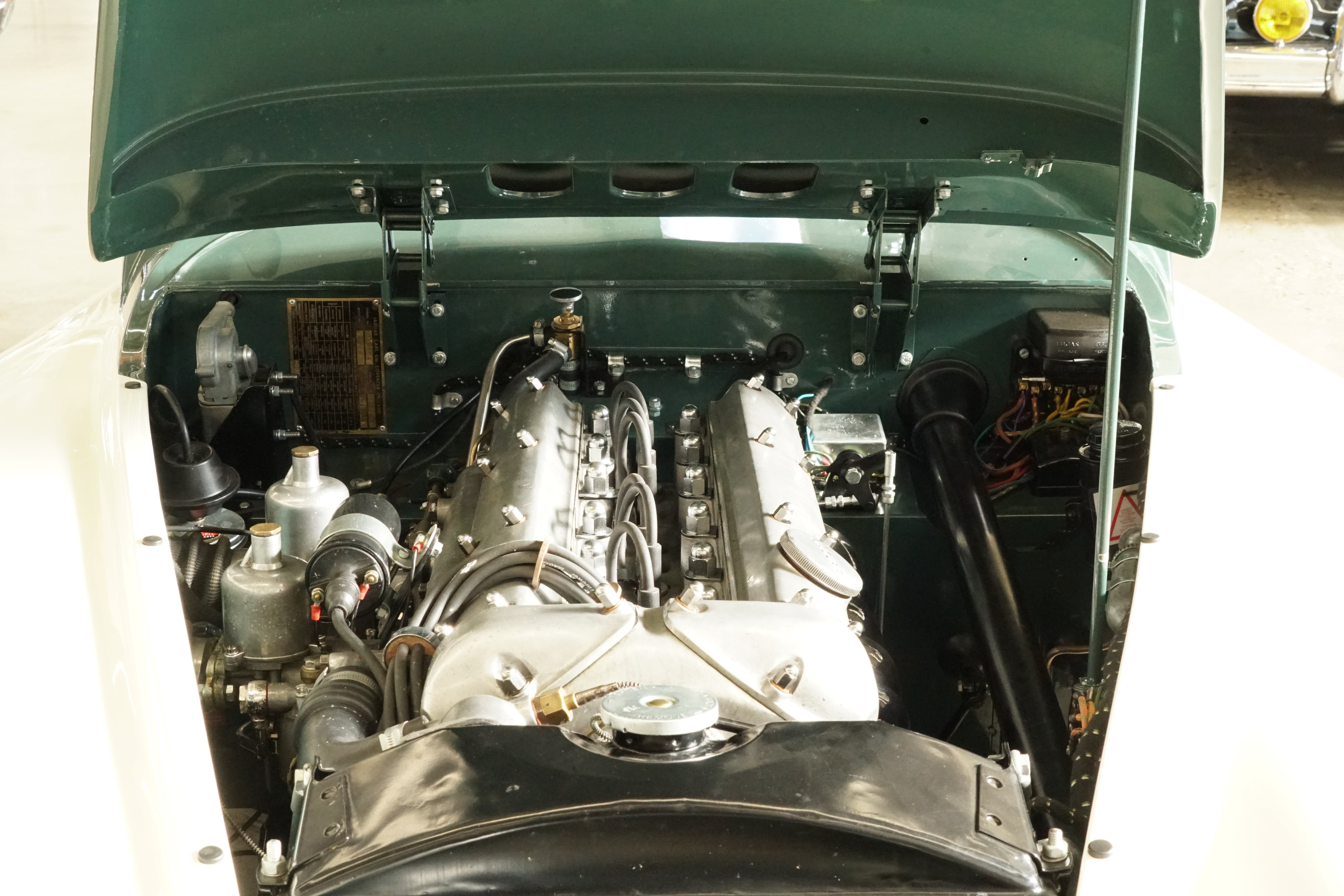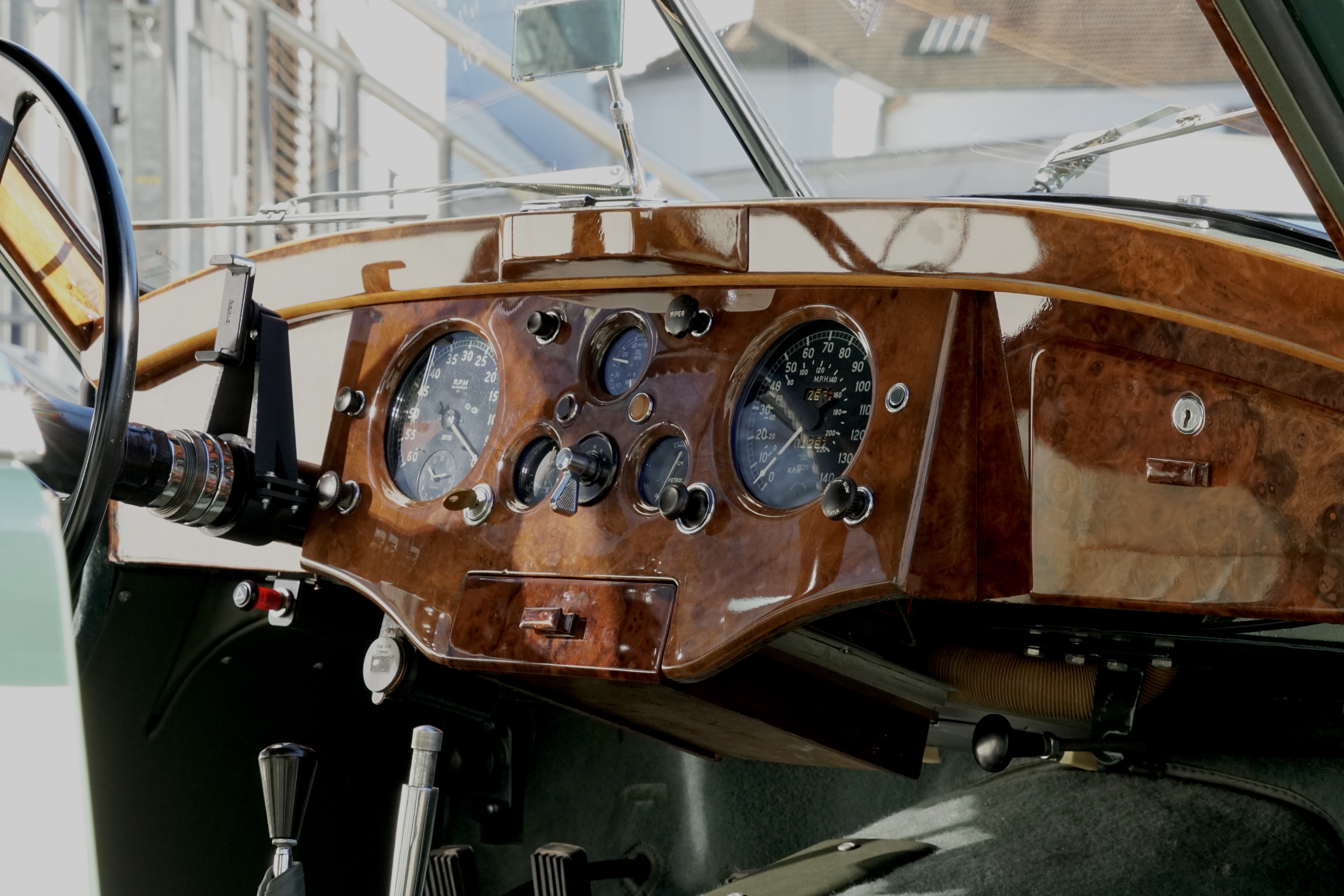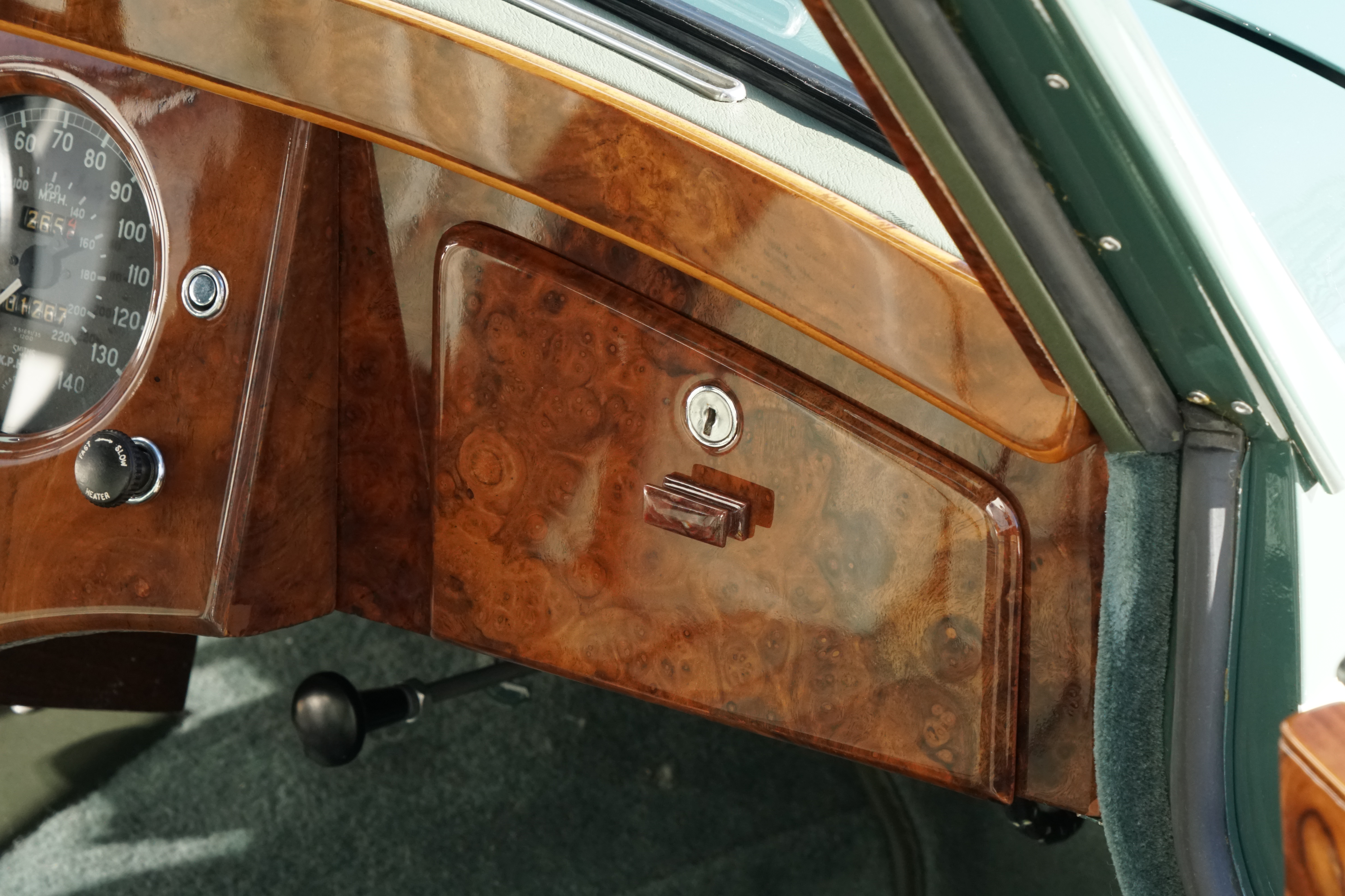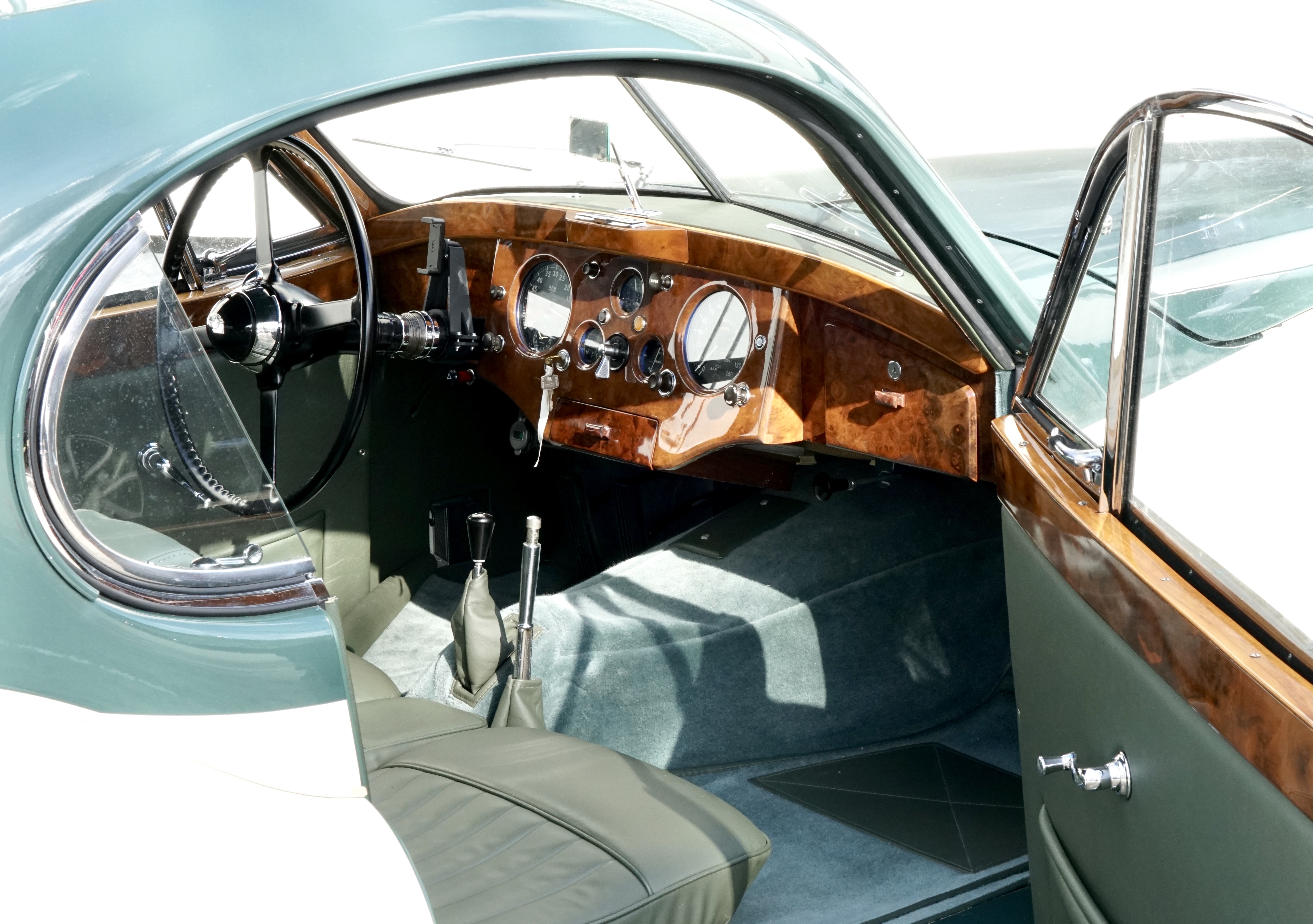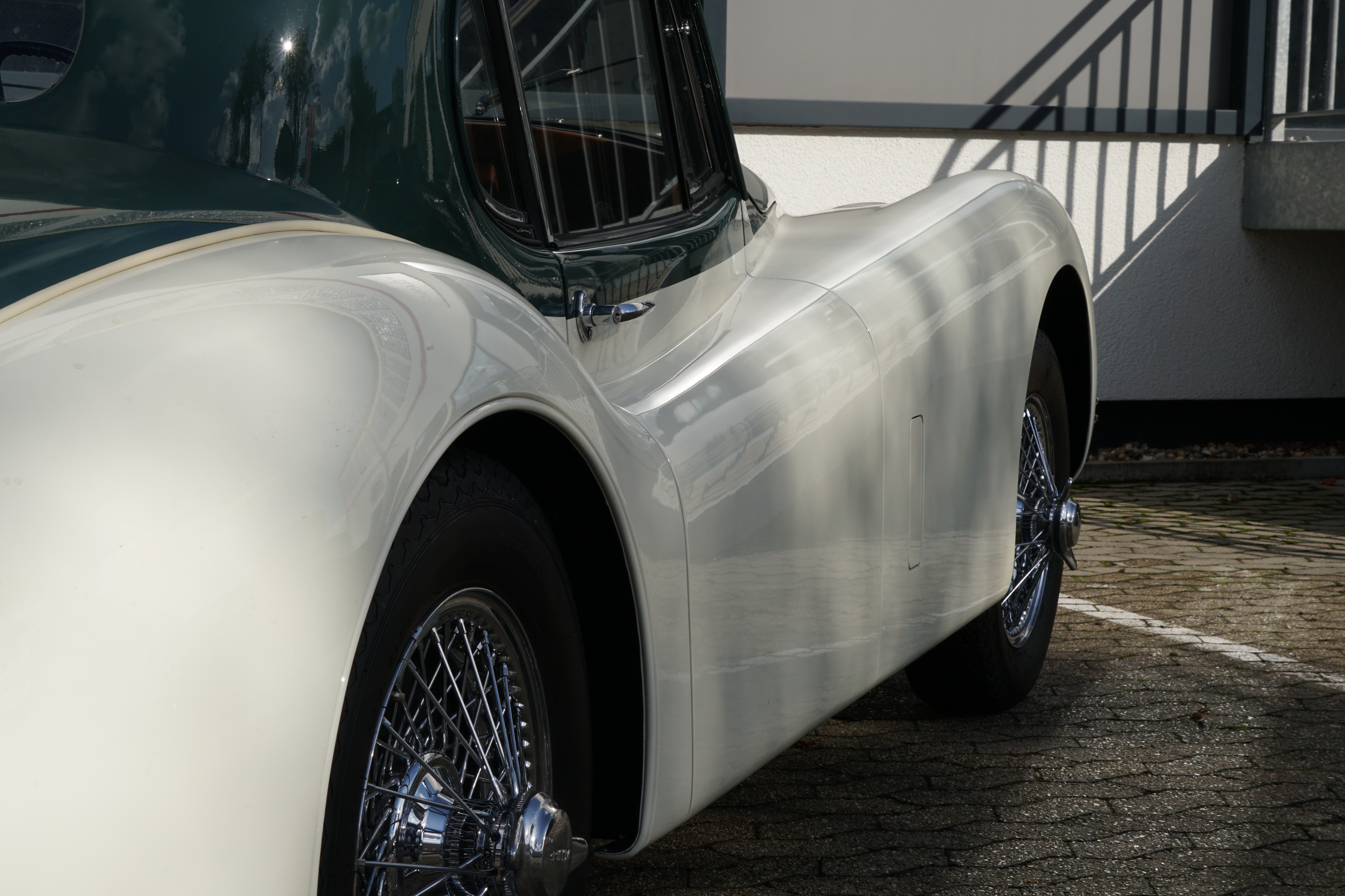 In 2014, this XK120 came to Germany and from then until 2022 was restored to a high standard by the owner with the help of renowned experts Nut and Bolt, whereby countless original parts were reused. The engine and gearbox were overhauled and the body was restored and finally painted in Cream over Green. With this Jaguar XK120 FHC, great importance was attached to a largely original reconstruction.